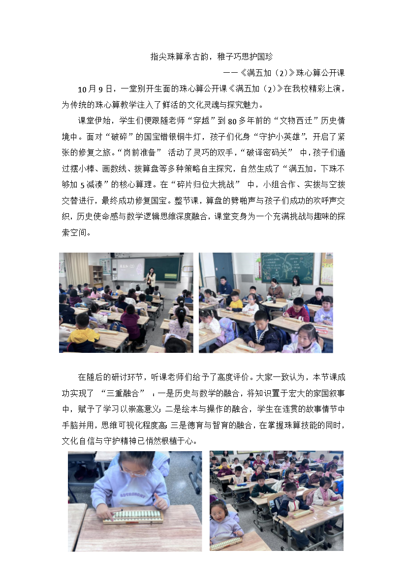 指尖珠算承古韵,稚子巧思护国珍 ——《满五加(2)》珠心算课堂展示