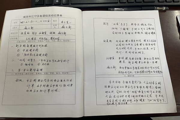 首先,姚元新老师结合“双减”政策,参考本学期的教学目标后制定了本学期的教学计划,和组内其他教师共同研究了本学期数学教学重难点,对书中的各项知识点进行了有序梳理。接着综合大家的意见初步拟定了申报课的安排,并将备课组活动任务进行了人员分工。